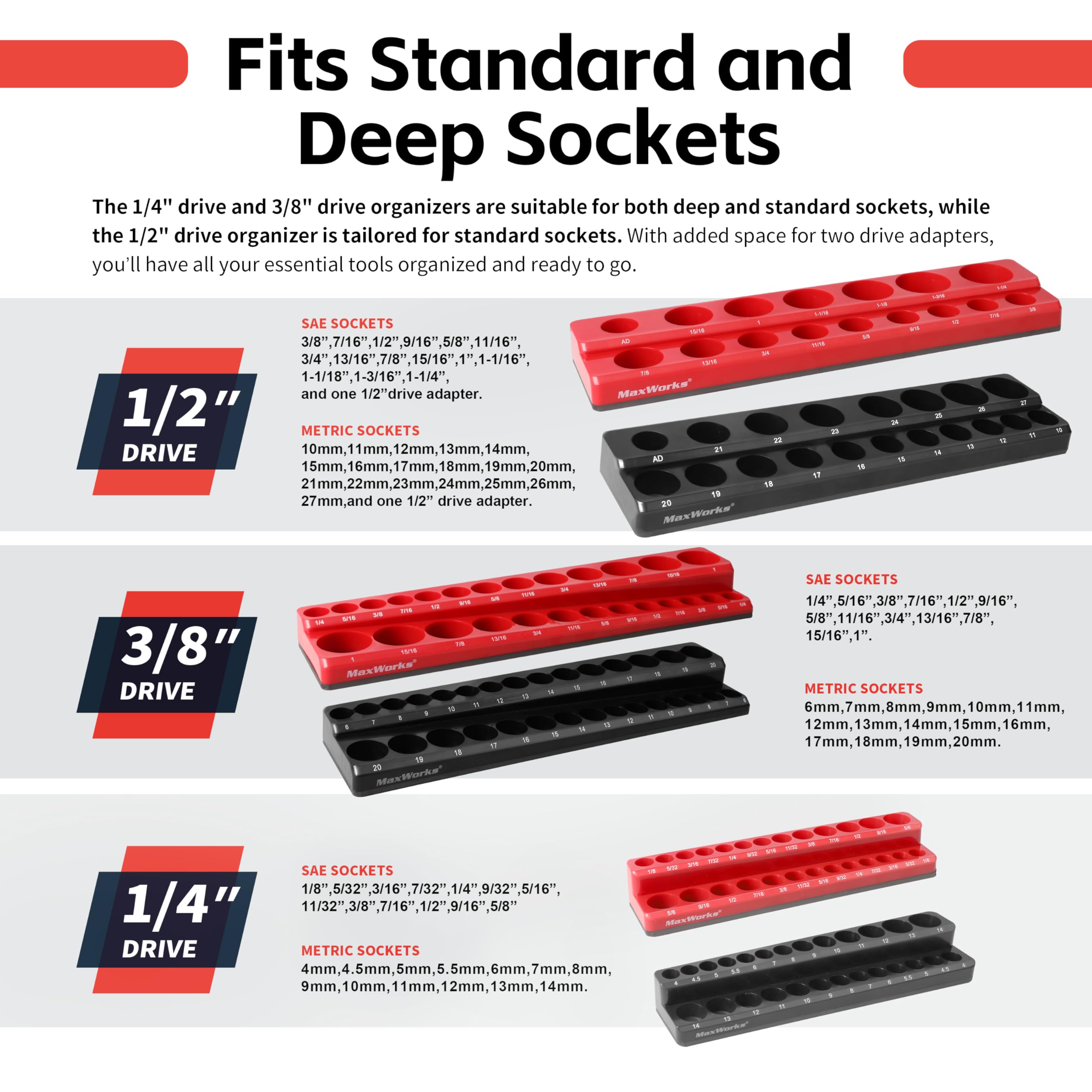 - [Fits Standard and Deep Sockets]: The 1/4" and 3/8" organizers are suitable for both deep and standard sockets, while the 1/2" drive organizer is tailored for standard sockets. With added space for two drive adapters, you’ll have all your essential tools organized and ready to go.