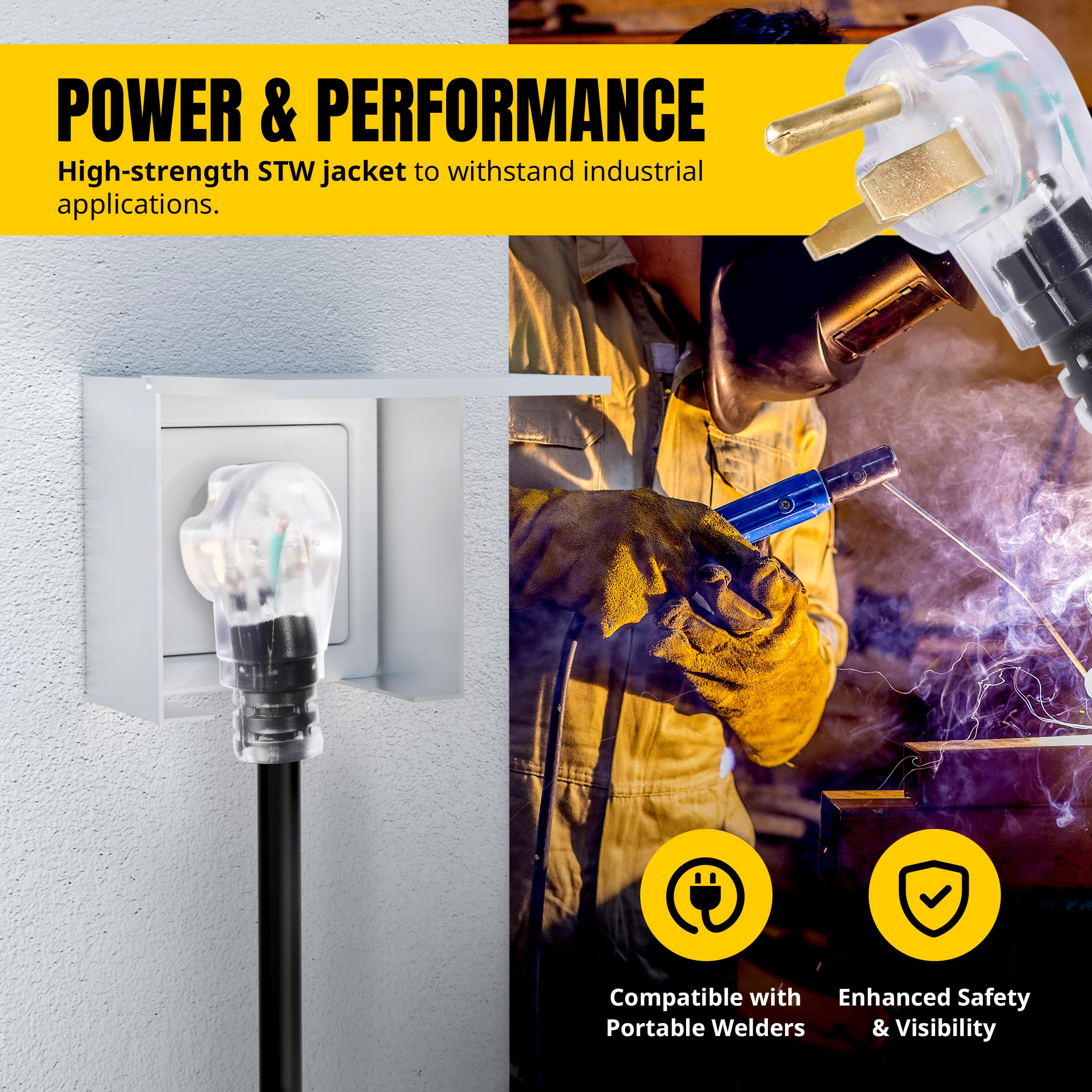 - Heavy duty 8 AWG (American wire gauge) x 3C all-copper wires with 6-50 NEMA plug and connector designed for use on all portable welders
