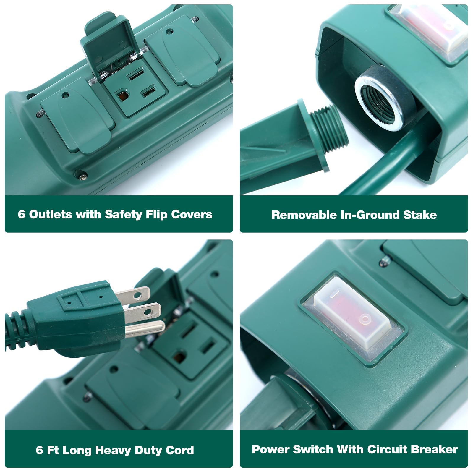 - Features 6 outlet double sided power stake with covers and industrial grade 14 AWG x 3 cord SJTW weatherproof 6-foot cord