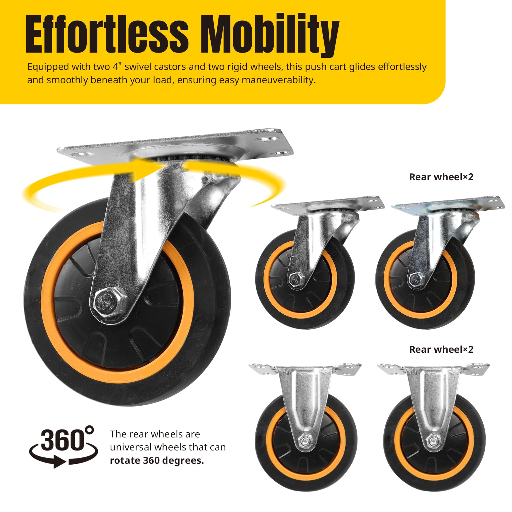 - Smooth t Mobility: Equipped with two 4" swivel castors and two rigid wheels, this push cart moves smoothly and seamlessly under load, ensuring minimal disruption