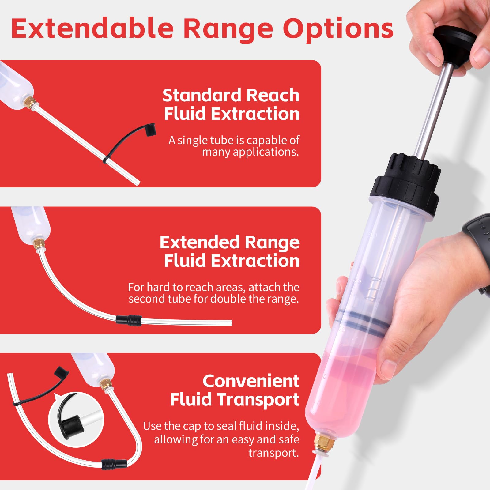 - [Multi-Fluid Extraction]: Ideal for removing brake fluid, coolant, gear oil, and power steering fluid before performing repairs. Simplifies maintenance by providing a quick, mess-free extraction method.